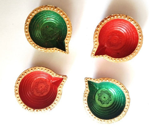 Decorative Empty Clay Diyas set of 4 pcs- (Green and Red)