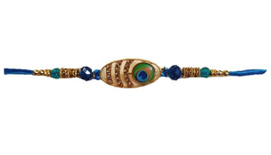 - This rakhi decorated with fancy stones, Peacock feather sticker and plastic beads moti that give attractive look to this rakhi.